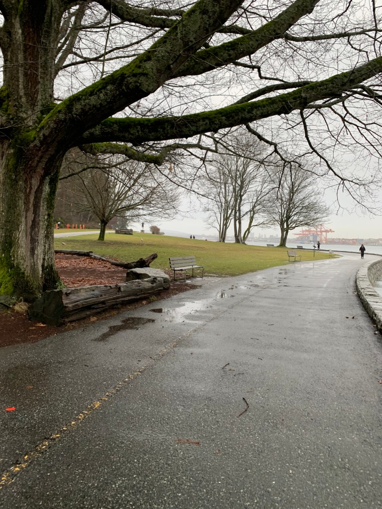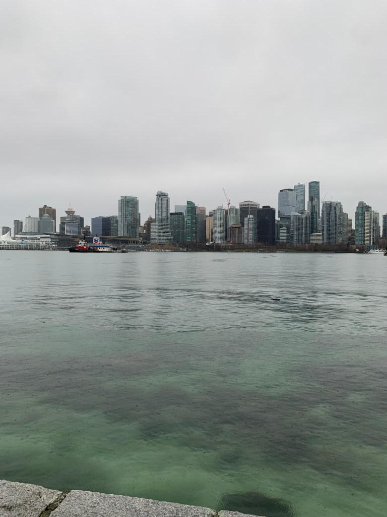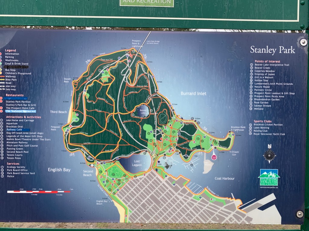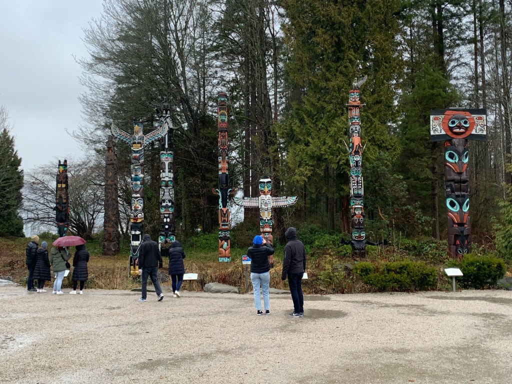 Our first stop was Stanley Park. Yes, it was named after the same Lord Stanley that the Stanley Cup is named after. It is 1,001 acres and has miles and miles of walkways and trails and so many things to do and see. It’s really beautiful even in the rain and provides lovely views of Vancouver.