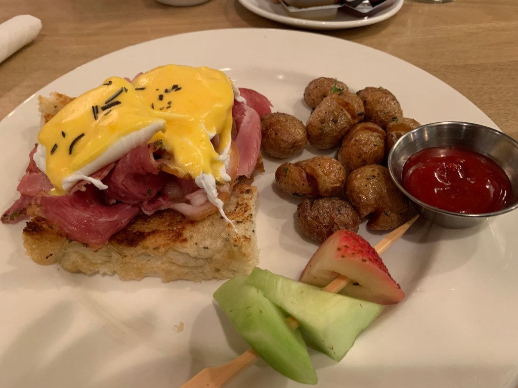 But, as you can see, there was no one there when I arrived at 7:05. It was a relief. While waiting for my breakfast (I splurged and ordered eggs benedict), I got a text from my friend Rita and of course we talked about food, but when I asked her if she thought my strategy–getting to restaurant before anyone else got there–would work at the dining car on the train, she admonised me, telling me I need to make friends on this trip.