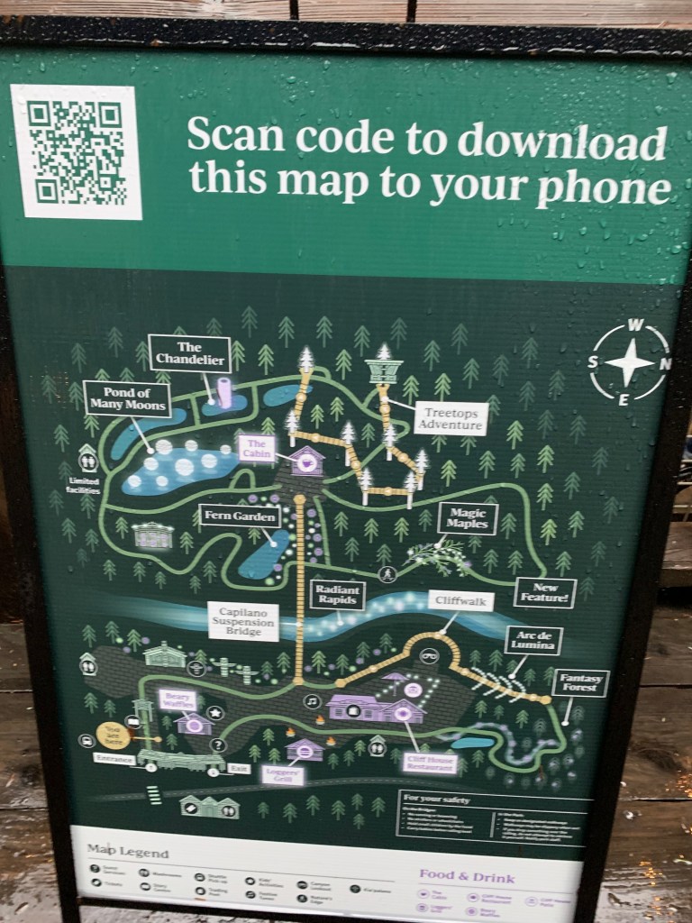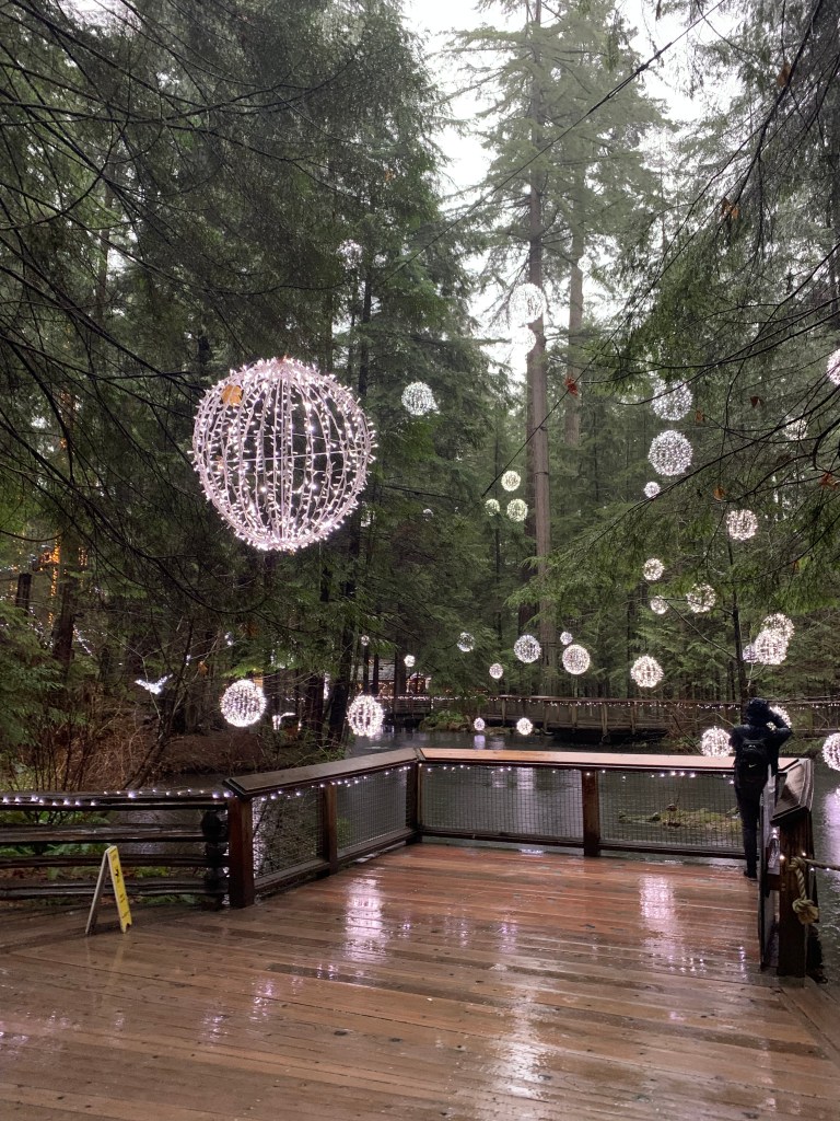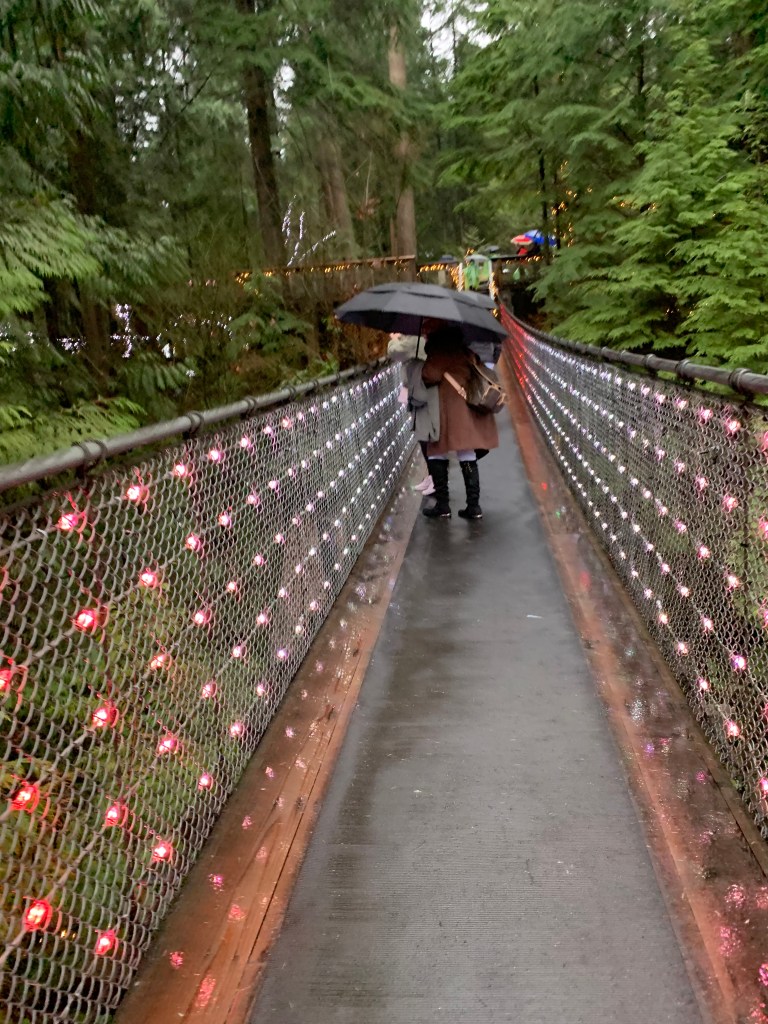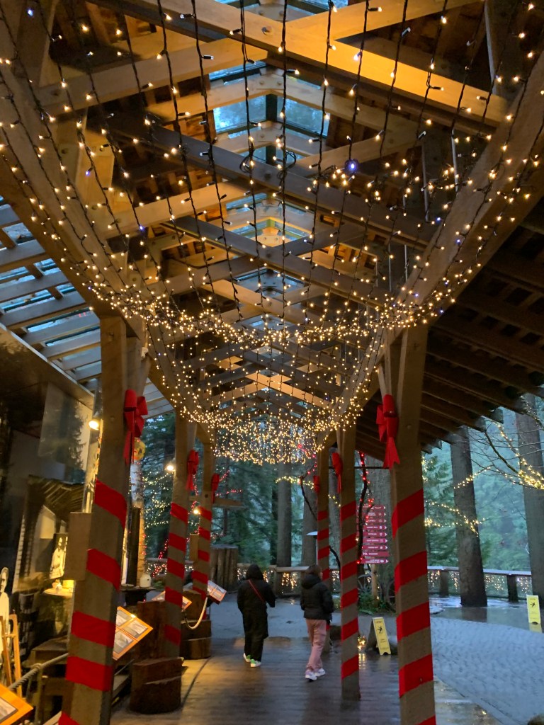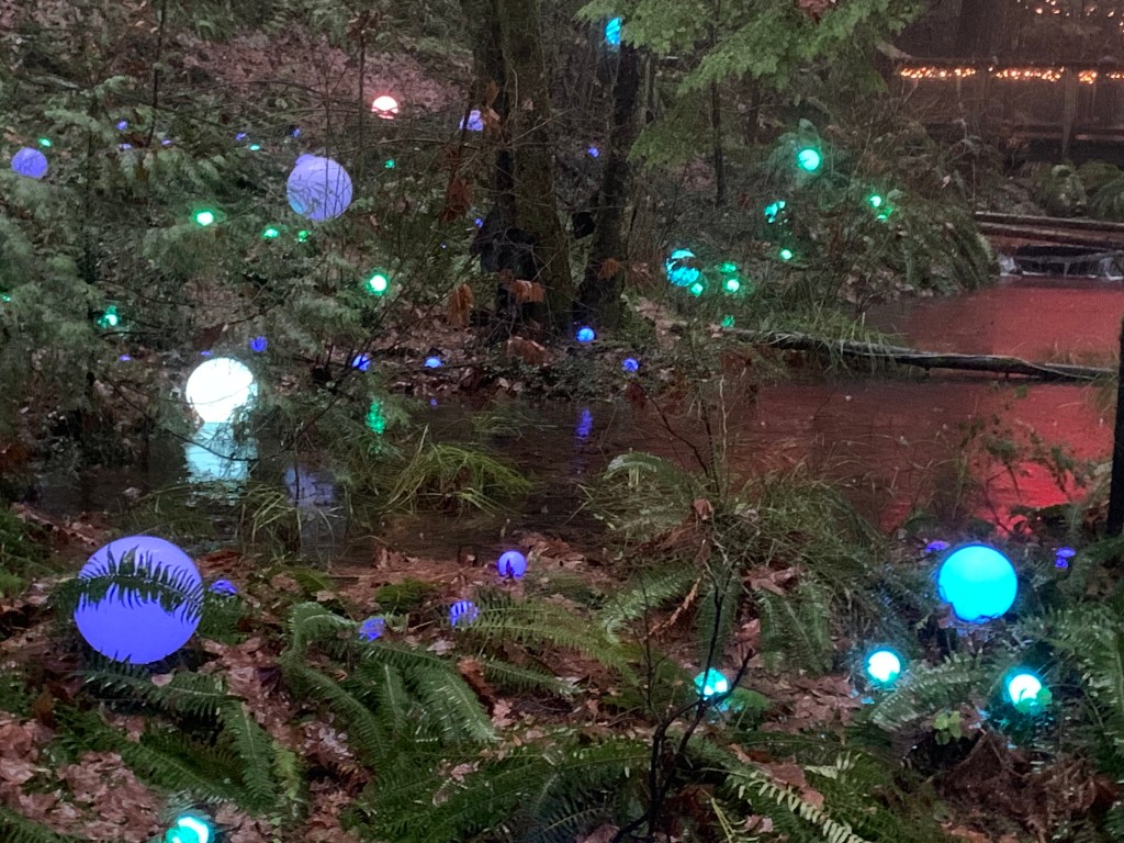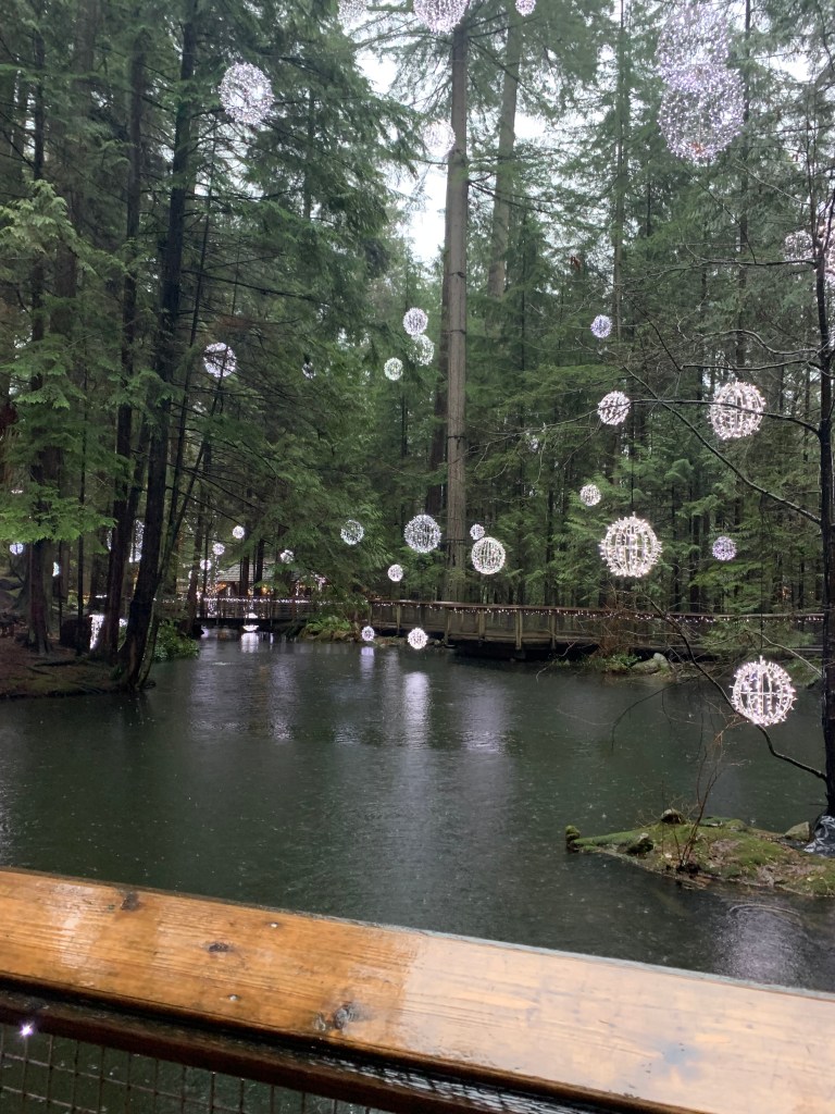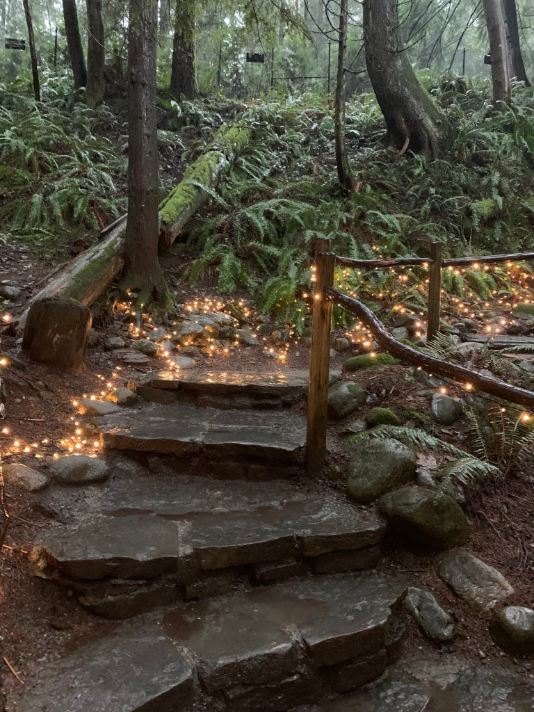 They still had their holiday decorations up and will have them up until January 22. The lights were actually not only beautiful but helpful to show deep into the woods since the combination of cloudy day and dense forest made it a bit dark. It would have been difficult to see many of the things in the forest if they had’nt been lit up. I passed by one of the train couples (stopping to hold her umbrella so she could take a picture), and she said to me that it made her think of what Rivendell must look like, and I couldn’t agree more. (Rivendell, for those of you who are not LOTR fans, is where the elves in Lord of the Rings live).