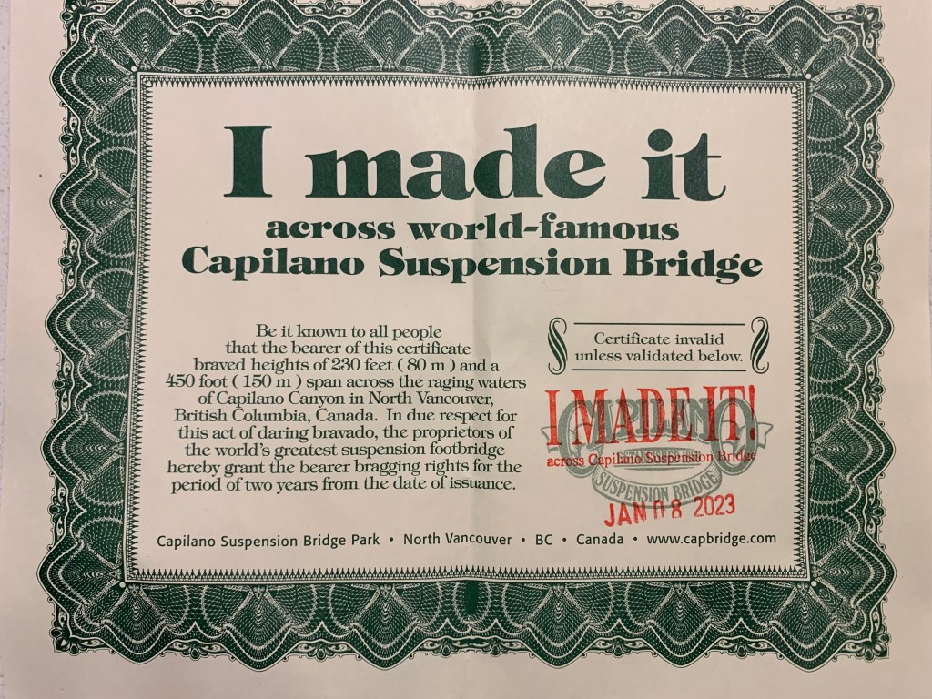 When we got back on the bus, our guide asked us if we all made it across the bridge. Apparently, sometimes people do lose their nerve and can’t make it all the way across. We all raised our hands, and then he passed out to each of us a certificate saying we actually crossed the bridge! Note that the certification only lasts for two years. After that, you have to come back and prove your mettle.