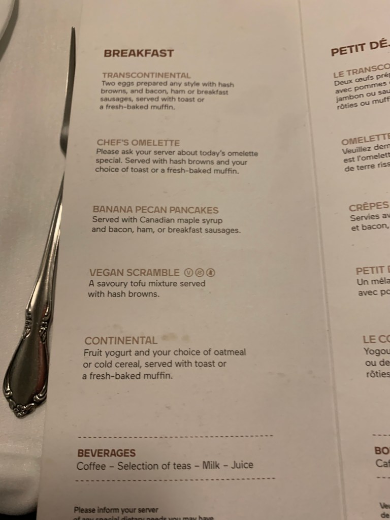 As you can see, there is a LOT of food on the train. I can’t imagine that you could eat three full meals and still need snacks. I’m going to be exercising even more in my room on the train ride to Toronto to work off the food because I don’t want to pass up tasting an option from each meal.