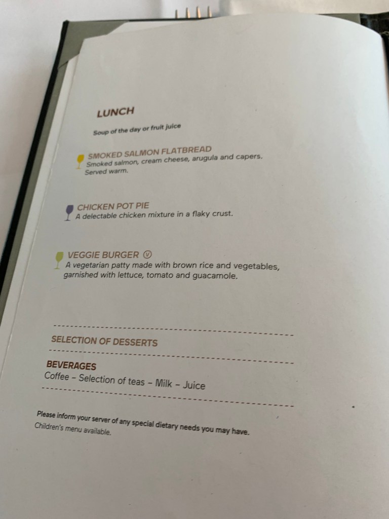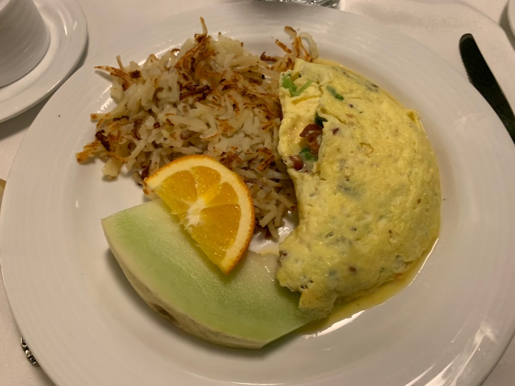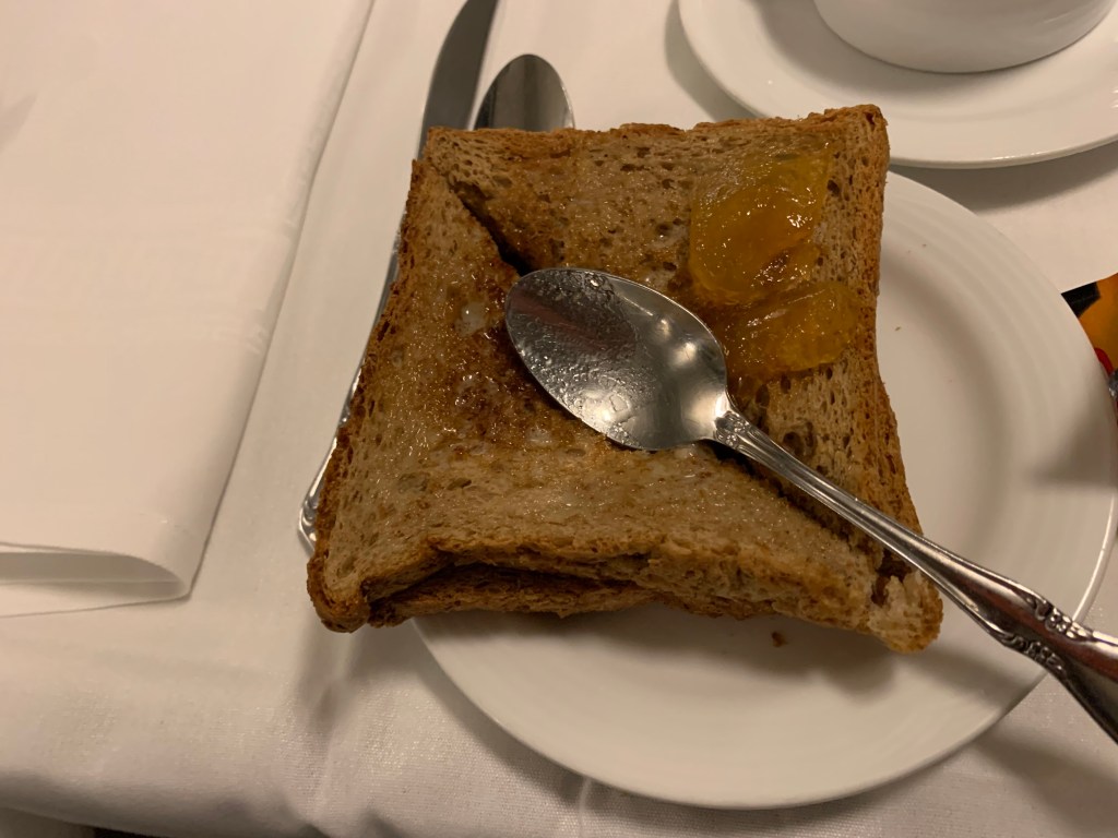 When I woke up, I had a taste for pancakes. However, I’m not fond of banana pancakes, and the chef’s omelette was bacon, scallions, and cheese. Since I’m a sucker for bacon . . . I also ordered wheat toast and tried some of the marmalade that my seat companion and I were curious about because it had no peel.