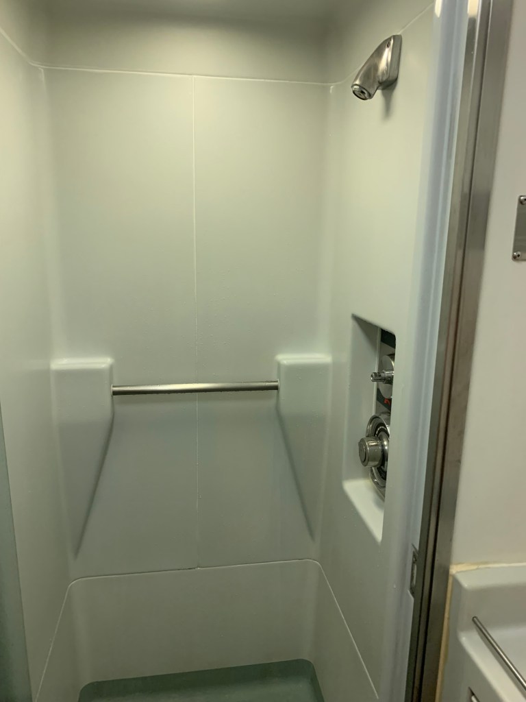 It was actually much bigger than I expected with a room outside of the shower with space for you to put items and to dry off and change. I was happy because I had plenty of time to slather on lotion before getting dressed. I had assumed I would have to get dressed and then undress to put on lotion back in my room. The shower was pretty much the size of a standard walk-in shower.