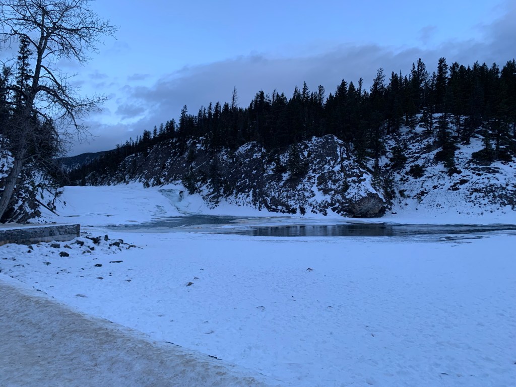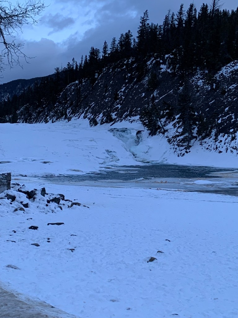 Our next stop was to see Bow Falls, which is a class 6 rapid when it’s not frozen. You can still see some water flowing. Erin told us that the 1953 movie River of No Return was filmed there, and people said that Marilyn Monroe sprained her ankle while filming the scene where she goes over the falls, but Erin told us that isn’t true. They used dummies for that scene. Marilyn Monroe sprained her ankle playing golf.