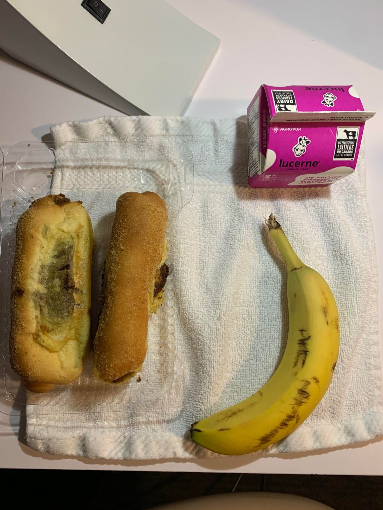 When I stopped by IGA the day before, I bought a two small cartons of milk, two bananas (the apples were 3X as expensive), and spanish rolls. I would have bought muffins, but IGA doesn’t sell fewer than 4 large size muffins, which I did not need.