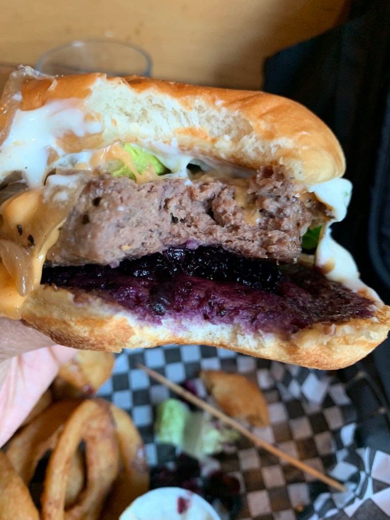 I’m also going to say that it would have never occurred to me to put blueberry chutney on a burger. But the combination–burger, grilled onions, lettuce, sauce, and blueberry chutney–was inspritational. The only thing I was sad about was that I was too full to order a milkshake like I had planned.