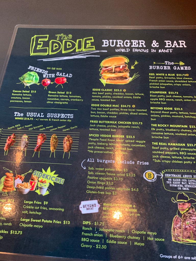 I got to the bottom and met a driver who took me back to town. She wanted to know if I was going to my hotel or if she could drop me off somewhere else. I had decided to go to Eddie’s Burger & Bar, so she took me closer to it which was nice. Not that anything is really far in downtown Banff, but I appreciated it because I was tired and really hungry.