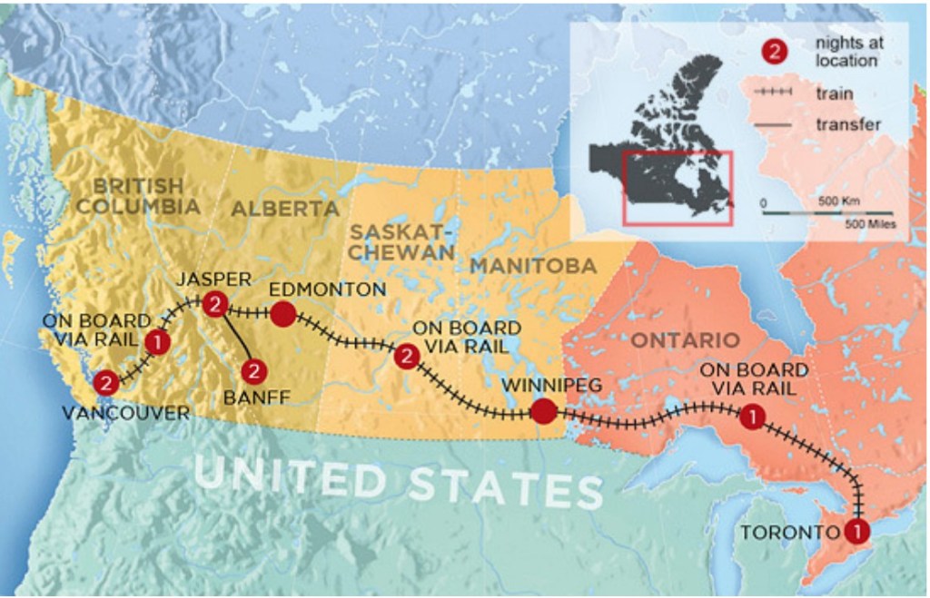 This will be my last post for several days. Today, I’m getting back on the train to travel from Jasper to Toronto. I’m posting the map of my trip again as a reminder. For those of you who have just started, make sure you go back. I have ten posts before this one for this trip.