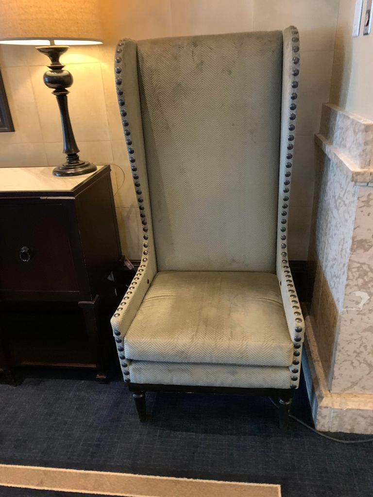 I have tried all of the different chairs in the lobby, and the one below is my favorite. It doesn’t look like it would be, but gosh, it was perfect for my back. I sat in it for at least 90 minutes reading without my lumbar support (it was with my luggage), and my back felt great. I can’t say that about any chair I’ve sat in for the last six years at least. It’s straight up in a 90 degree angle in the back, which makes it look uncomfortable.