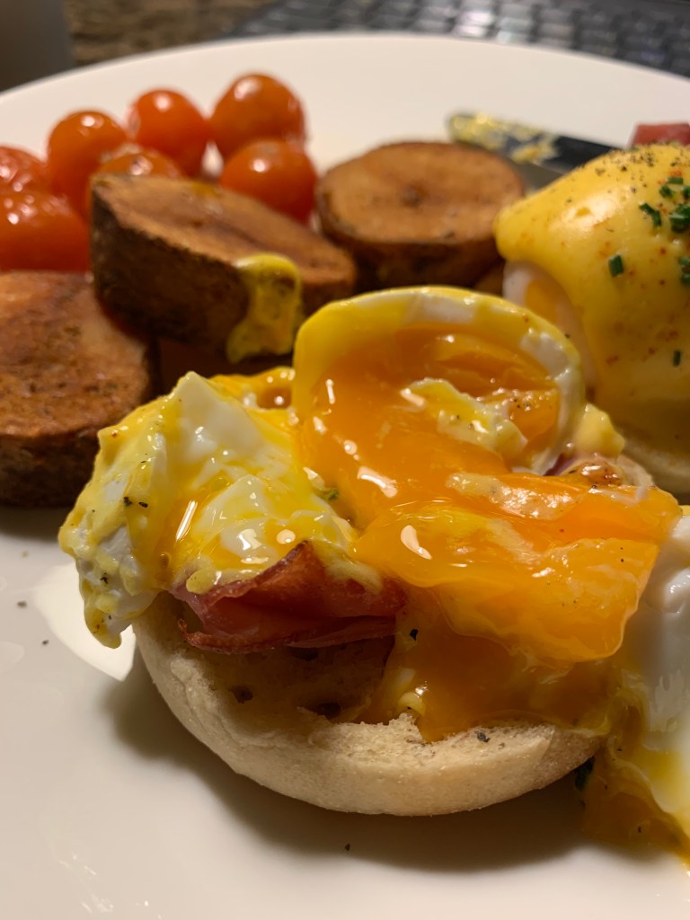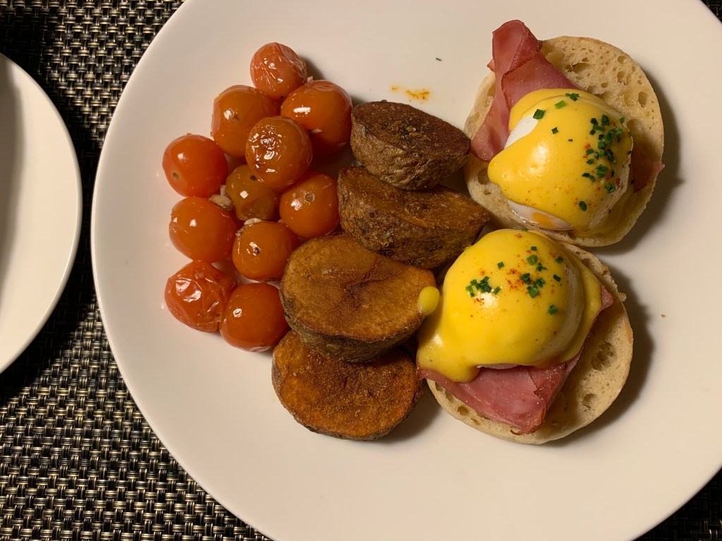 Yes, I did get eggs benedict again because I truly love it, and I NEVER have it. I also never think to pan fry cherry tomatoes like that. They were delicious.