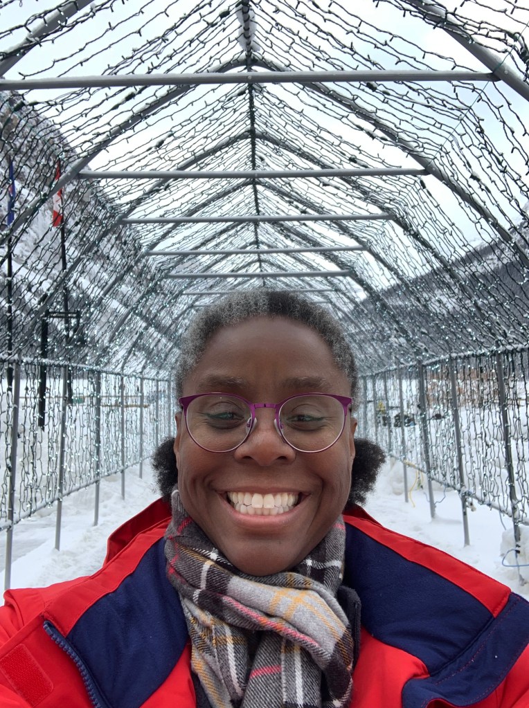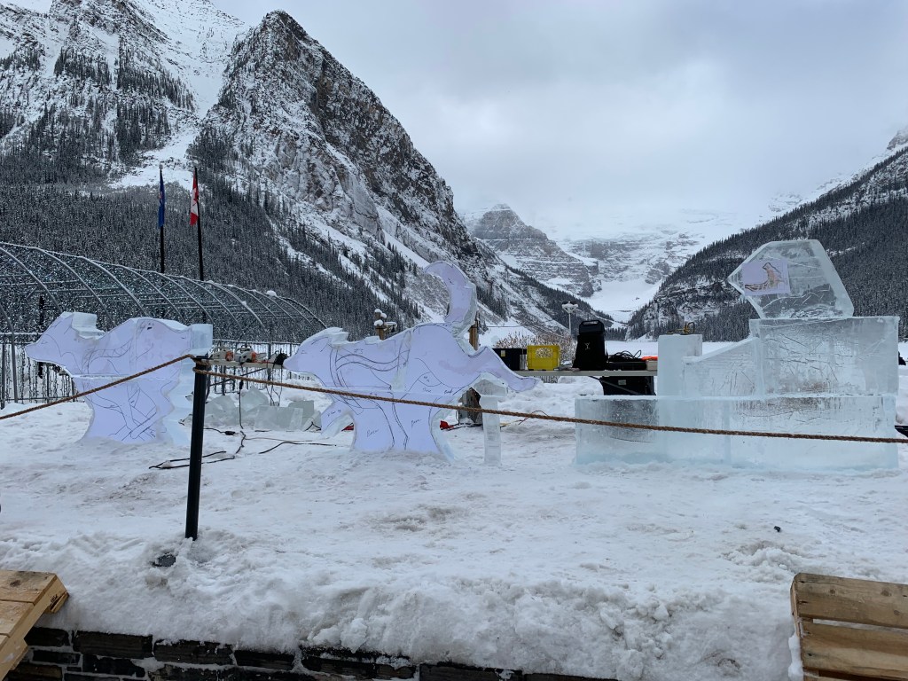 After they came to get my bags, I left my room and went to find the sleigh ride sign-in place and then walked around for a bit outside while waiting. They are starting to do some ice sculptures, and I noticed details about the place that I hadn’t when I walked on lake yesterday.
