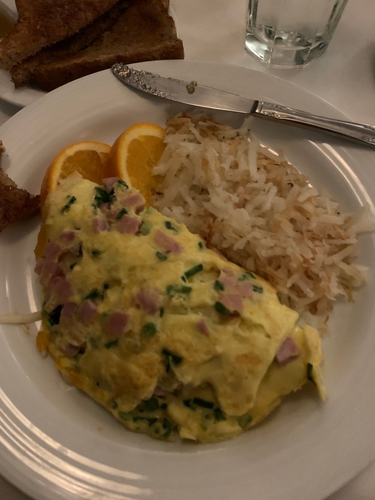 Thursday breakfast: Chef’s omelette is ham, cheese, and scallions. I always have the toast.