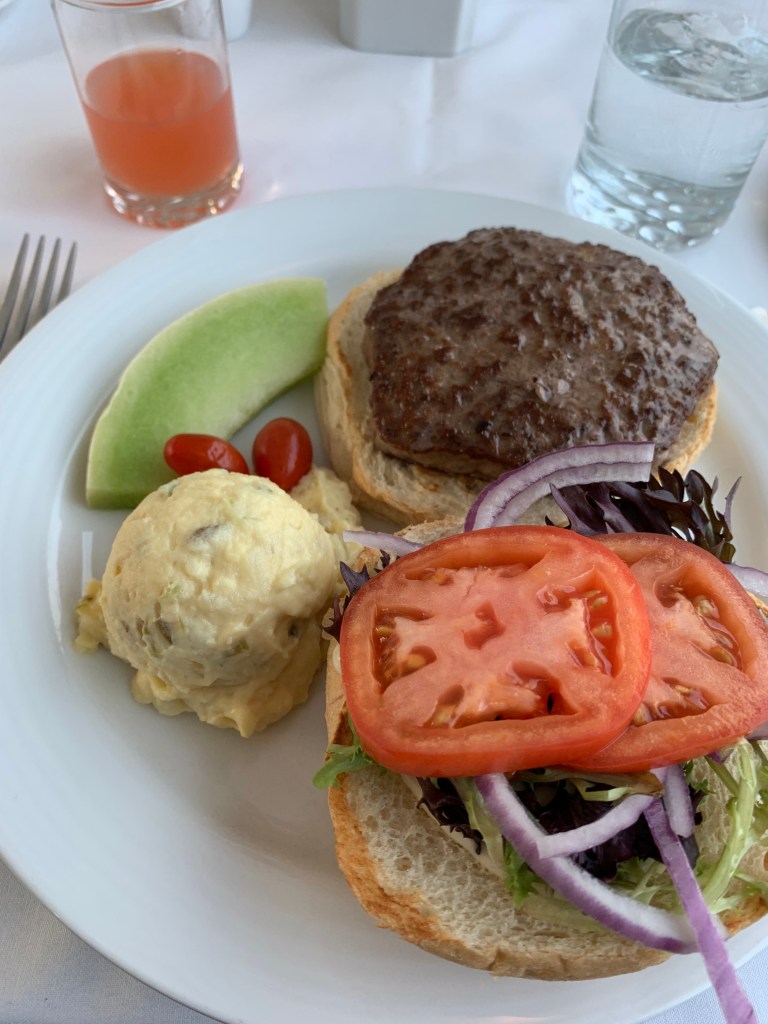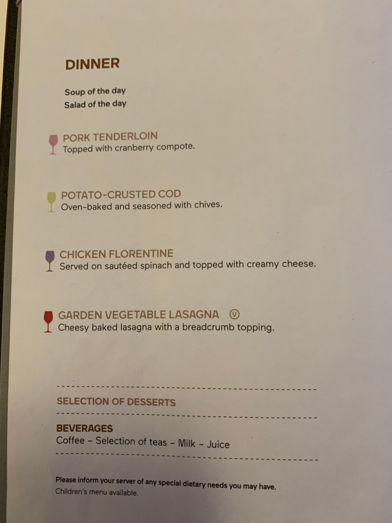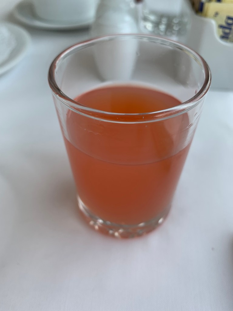 I forgot to take a picture of the menu, but the other options were a tuna melt and a couscous salad. The soup was tomato bisque, but I was still full from breakfast, so I asked for grapefruit juice instead. Juice is the alternate option to soup at lunch.