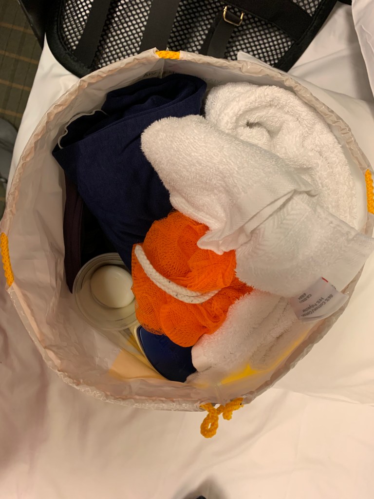 By 5:30 AM, I am putting together my shower bag, using one of the shower kit bags and including my clothes for the day, toiletries, one of the towels, and a washcloth. When I first boarded the train in Vancouver, and I had my onboarding from the porter there, he warned me that there would be times in the morning and evening when lots of people want to shower. I never want to be caught having to repeatedly walk down the corridor with my things only to find the shower occupied. It’s not something you can tell from any distance. It’s not like the lights for the bathroom on an airplane that let you know if the bathroom is vacant before you leave your seat.