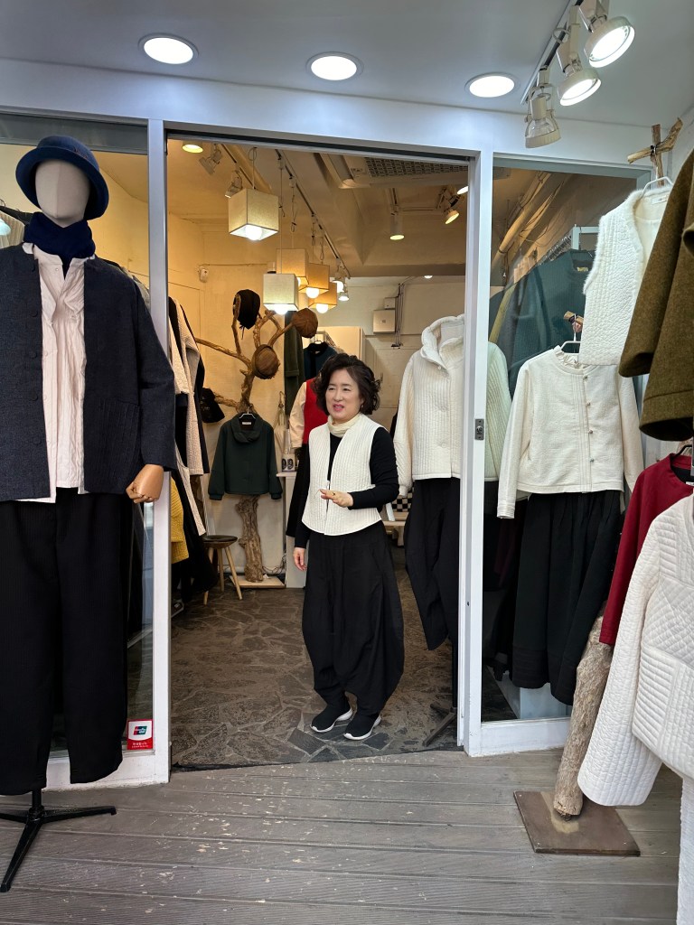 Instead, we went to two shops that made more traditional Korean-style clothes with a modern twist. I don’t like clothes shopping with Seunghye because as a fashion designer, she is very critical of fabrics and construction. I also didn’t want to look at clothes because I was sure that there wouldn’t be anything to fit me. I did let them convince me to try on something at first store, but it didn’t fit across my breasts. Sigh. But Seunghye found something really nice.