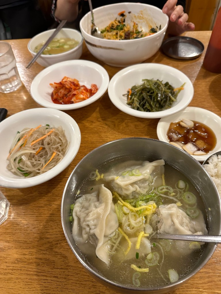 Seunghye was starving, so we focused first on finding a place to eat on a Friday at lunch time during holiday. Kids are still on break here from school. The first place she picked was crowded and didn’t have a table, but the next place she picked only had a couple of people; it looked like several tables of people had just left. A little place. Not a lot of items on menu, but big portions and delicious and good price. I had dumpling soup, which was great for such a brisk day, and she had bibimpap. Look how big those dumplings were! They were as big as the palm of my hand.