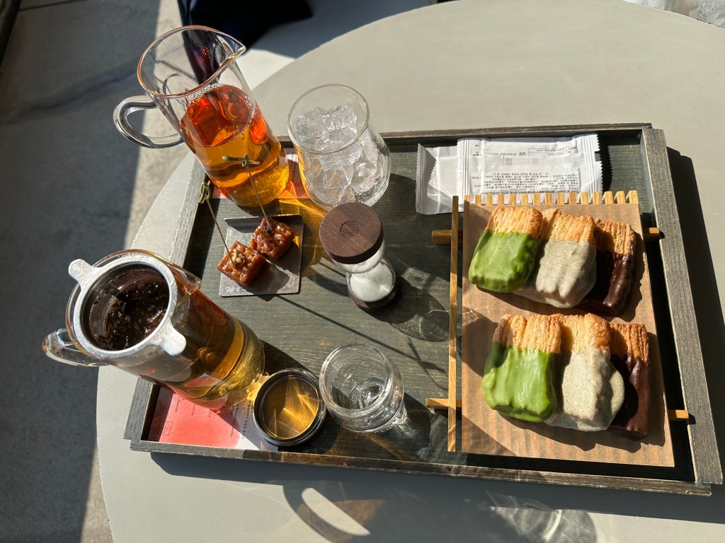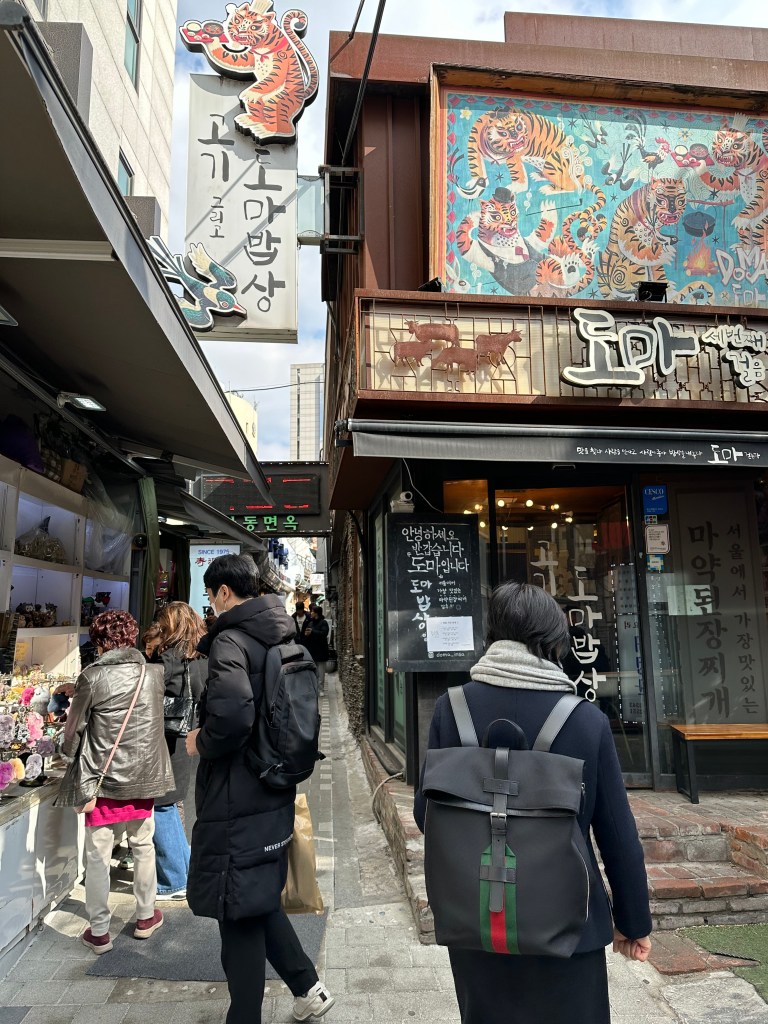 After lunch, we just walked around. There was one shop she wanted to go to, and she looked up another location for Osulloc. I stopped at a shop to buy earrings, which you can get really cheaply here, and I kept myself from buying socks. I don’t need socks, but South Korea makes the best socks I have ever had. Socks you buy for $2 from a street vendor have lasted me longer than socks I have bought in the US in a department store. But I have a sock habit, and I am still trying to erase the memory of 2019 when I made a list of the items I had bought over three weeks for my declaration list (really just need cost) for customs, only to realize that I had bought over 20 pairs of socks!