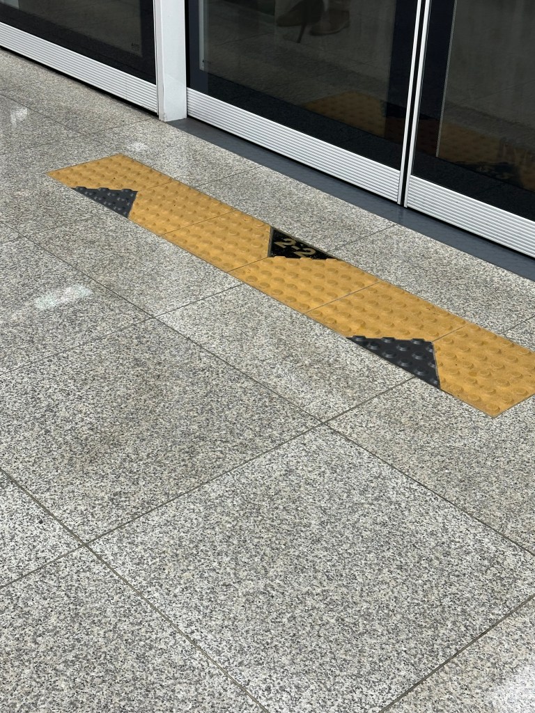 What you will notice from the pictures is that the train tracks are not accessible to passengers. For the majority of the stations this is true. When a train arrives, the doors of the train slide open and these do, too. Never a fear of being tossed onto the tracks. The other item I like are the spots of the floor in front of the doors. As you can see, there are two arrows pointing towards the door. Each represents the first spot for the first person in line to get on. Everyone else is supposed to line up behind that person, and people do!