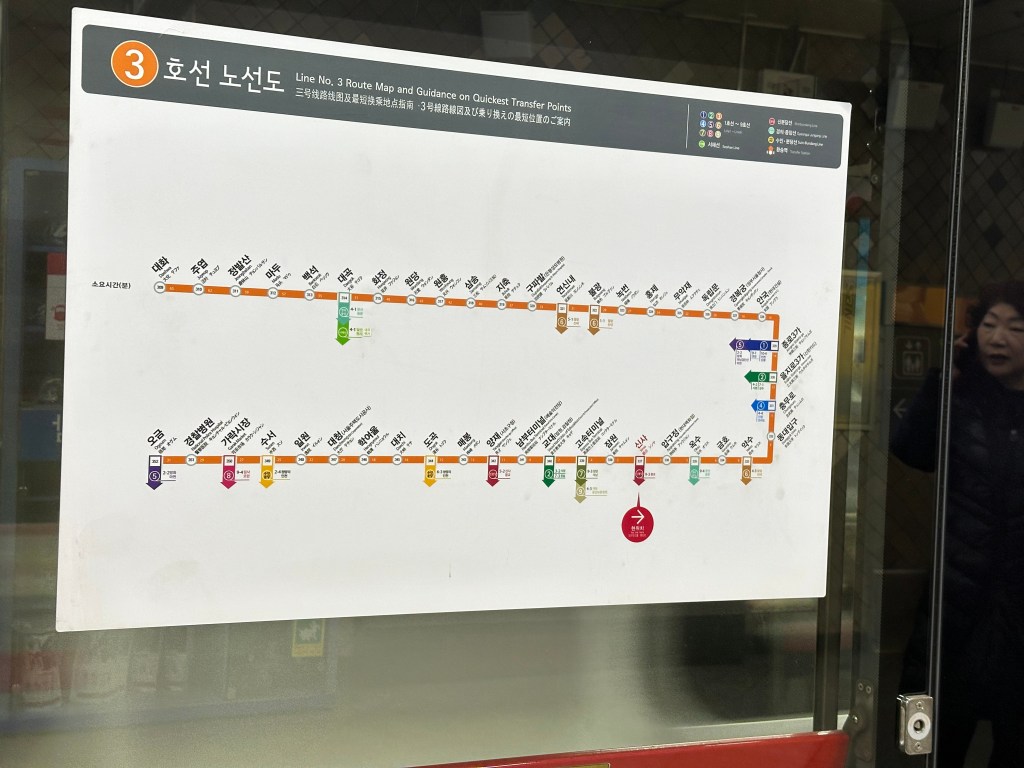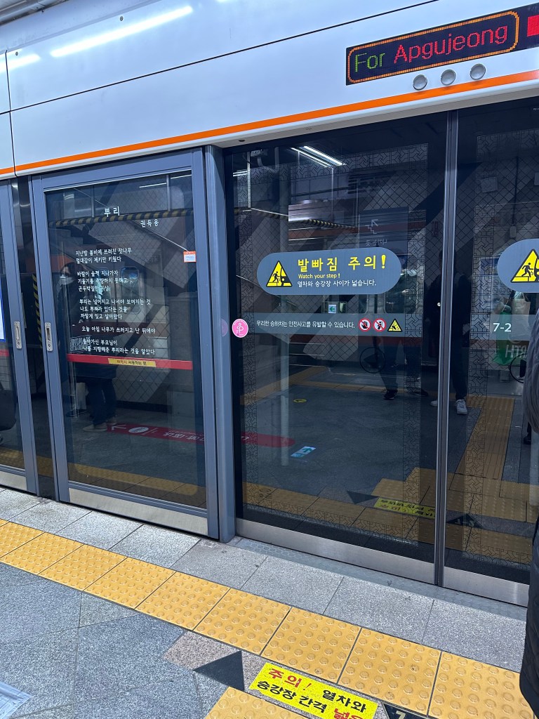 But can I tell you how much I love the subway system in Korea? I didn’t take many pictures because I was in a hurry and it was crowded on the way back, but I did take some to try to show people what is so great about it. First, it’s clean and bright. Not like the subways in Boston or Philadelphia. Signage is also really good.
