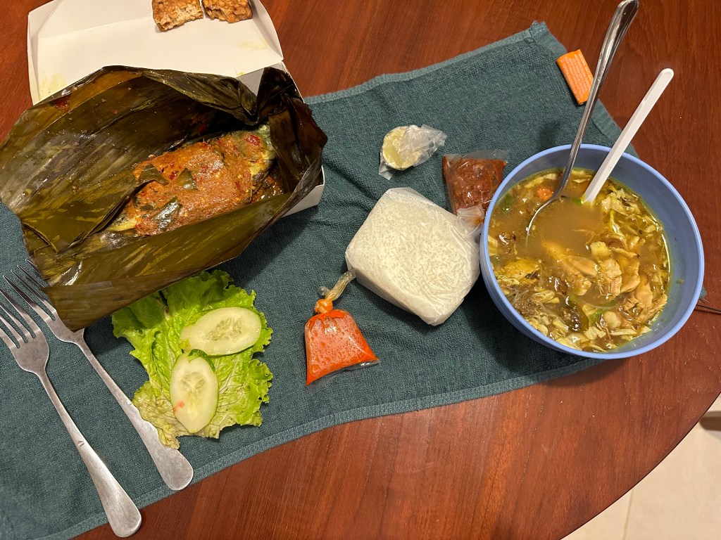 Pepis Ikan Mas (carp in a sweet-spicy sauce) and Soto Ayam (Indonesian chicken soup)
