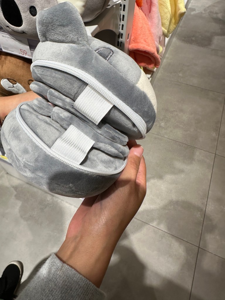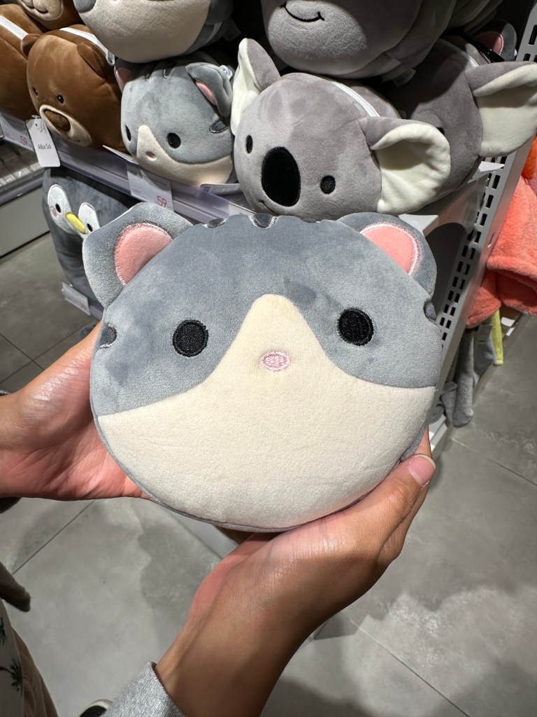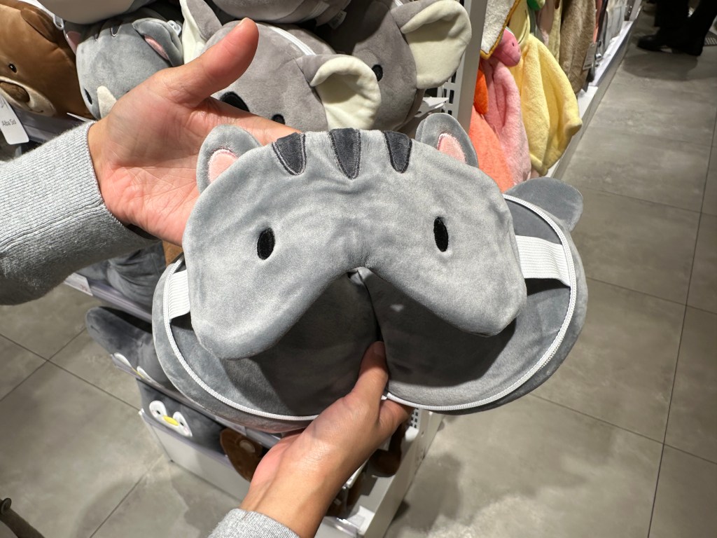 Afterwards, we went back to the bowl store to decide, bought bowls, and headed to another part of the mall to get some groceries, but Kiana wanted me to stop at a store that she couldn’t figure out. It was an odd mix of makeup, craft ideas, stationary, electronic gadgets (like earbuds), hair accessories, puzzles, snacks, and odd stuffed things like the one below: