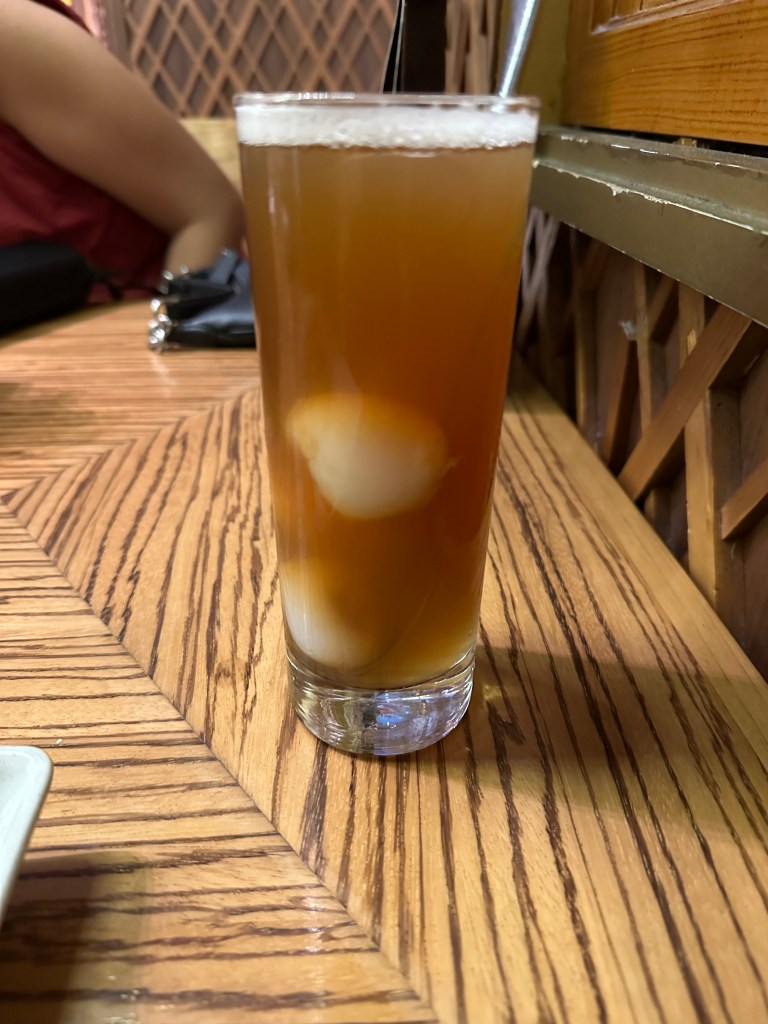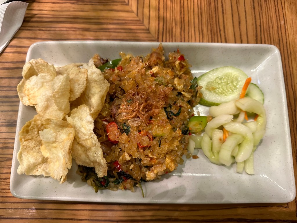 I really wanted to try Indonesian fried rice, which I had heard much about, so that’s what I finally decided on even though so many other things were tempting. I also ordered a drink that had longan in it because I wasn’t sure when I’d get that fruit again. I need to check at my local Asian market.